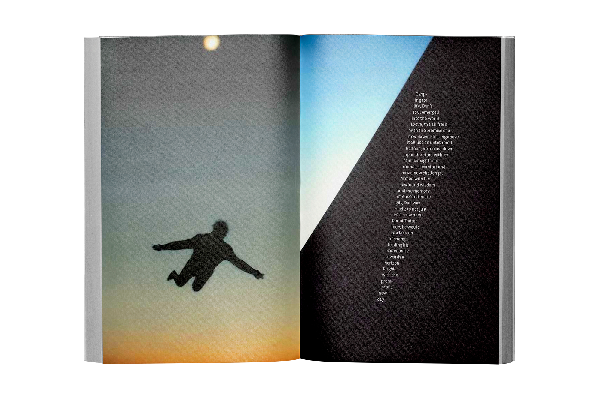 The book’s structure changes as Dan finds himself among the aisles. Early pages are orderly; later ones distort. Margins compress, captions drift, and the graphic sequence interrupts the narrative with imagery and typography that follow his internal collapse. Design becomes the primary narrative device.